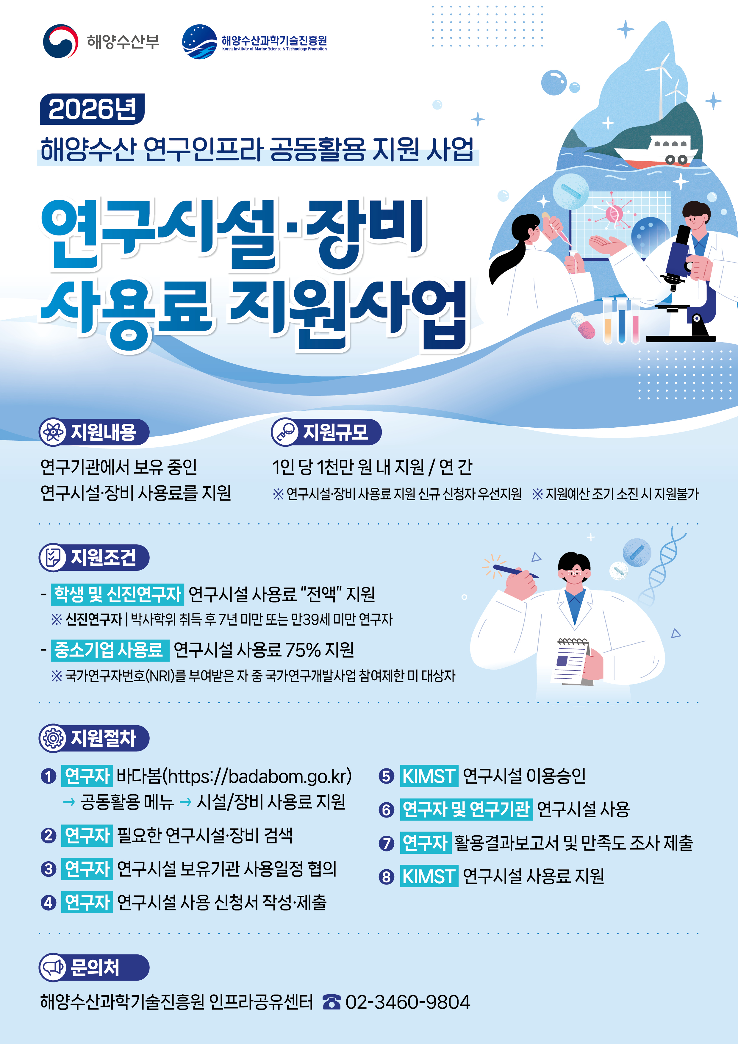 2026년도 해양 연구 시설·장비 사용료 지원사업 안내 □ (사업명) 2026년도 해양 연구 시설·장비 사용료 지원사업 □ (목 적) 해양수산 R&D투자를 통해 확보된 연구시설․장비의 공동활용 및 관리・활용체계 구축을 통해 정부 예산투자 효율성 제고 □ (지원대상) 공동활용 대상 연구 시설·장비를 이용하고자 하는 연구자 * 공동활용 신청일 기준 국가연구개발사업 참여제한 대상자는 신청불가 □ (지원규모) 대상에 따라 연구시설 사용료 차등 지원(신규 신청자 우선지원 ) 지원대상 지원내용 비고 학생(학·석·박사과정) 및 신진연구자** 사용 건당 최대 100% 이내 지원 1인당 천만원 내 지원/연간 중소기업 사용 건당 최대 75% 이내 지원 * 대학생연구자 : 학·석·박사 과정, 신진연구자 : 만 39세 미만 또는 박사학위 취득 후 7년이내인 연구자 ** ‘26년 해양 연구 시설·장비 사용료 지원사업 예산 소진 시 까지 자원가능, 단 예산 소진 이후에는 신청자가 사용료 부담하는 조건으로 연구 시설·장비 사용 신청 가능 □ (대상인프라) 한국해양과학기술원(부산,포항), 한국해양조선기자재연구원, 중소조선연구원, 서울대학교 기초과학공동기기원 보유 연구시설·장비 * 공동활용 대상 인프라 현황은 바다봄 공동활용 페이지(https://badabom.go.kr) ** 대상시설·장비는 운영기관 사정에 의해 변경될 수 있음 및 별첨 참고 □ (운영기간) 안내 시 ~ 11월 30일(예산 소진 시까지 □(신청방법)바다봄 홈페이지(https://badabom.go.kr)를통해 이용 희망 연구 시설·장비 검색및 신청서 제출 ① 연구자 : 바다봄(https://badabom.go.kr)→공동활용 메뉴 →시설/장비 사용료지원 접속 ② 연구자 : 필요한 연구 시설·장비 검색 ③ 연구자 : 연구 시설·장비 보유기관 담당자와 시설·장비 사용일정 및 조건 협의 ④ 연구자 : 바다봄 “시설/장비 사용료” 지원 메뉴를 통해 연구 시설·장비사용 신청서 작성·제출 * 제출서류 : 신청서, 사업자등록증(해당시), 재학증명서(해당시), 학위증명서(해당시), 참여 자제한 여부 확인서 ⑤ KIMST : 연구 시설·장비 사용승인 ⑥ 연구자 : 연구 시설·장비 사용 완료 후 및 활용결과 보고서 제출 및 만족도 제출 * * 바다봄에 만족도, 활용결과 보고서 미제출시 지원금 처리 불가 ⑦ KIMST : 연구 시설·장비 사용료 지원 ㅇ (문의처) 구 분 담당부서 전화 및 이메일 해양수산과학기술진흥원 인프라공유센터(나미애 책임) 02-3460-9804 nana4084@kimst.re.kr